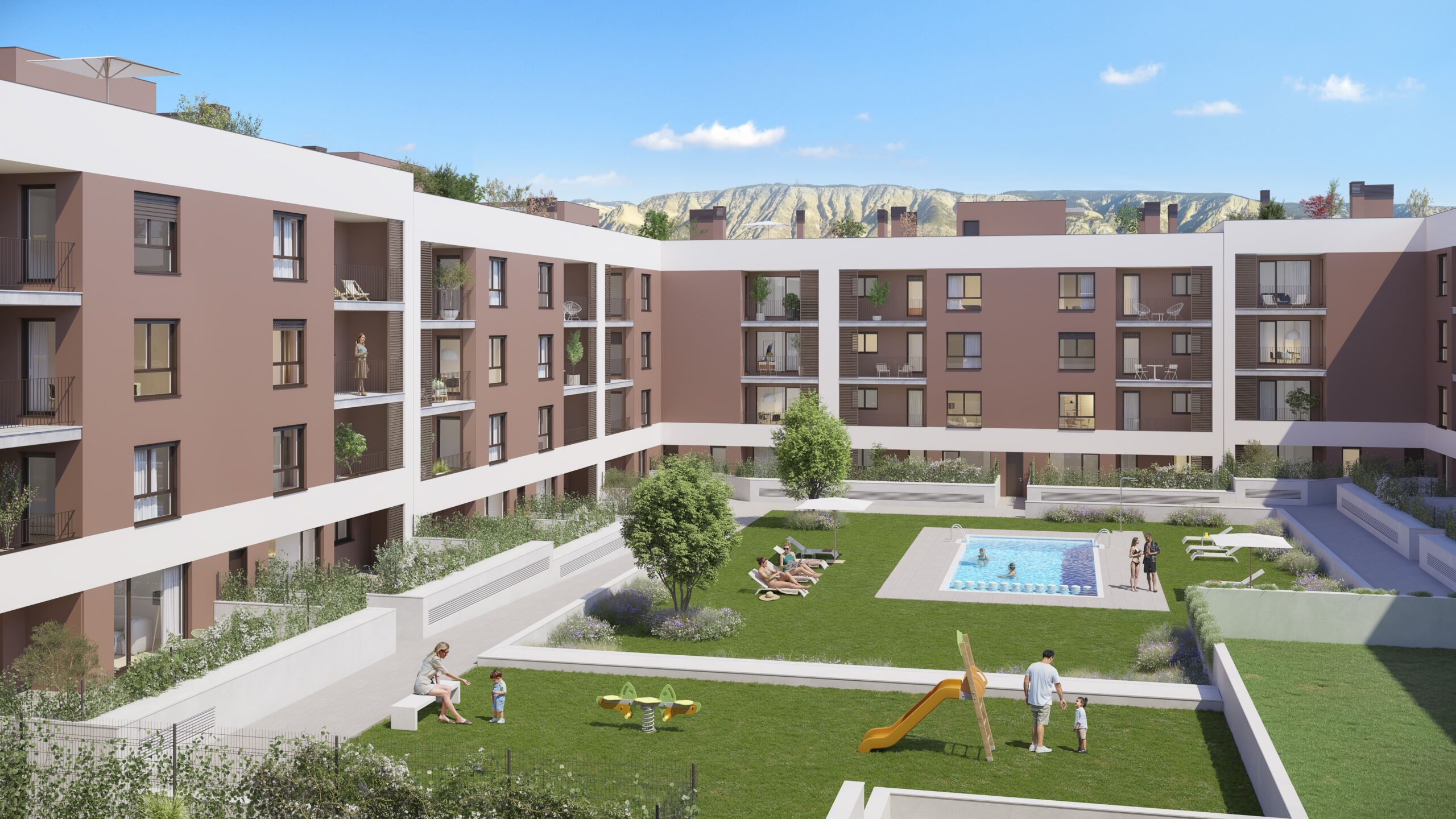 Las viviendas de obra nueva en Casetas Zaragoza permiten disfrutar de un entorno seguro, con servicios educativos, zonas infantiles y un ambiente residencial ideal para criar a los hijos, sin renunciar a la cercanía con la ciudad.